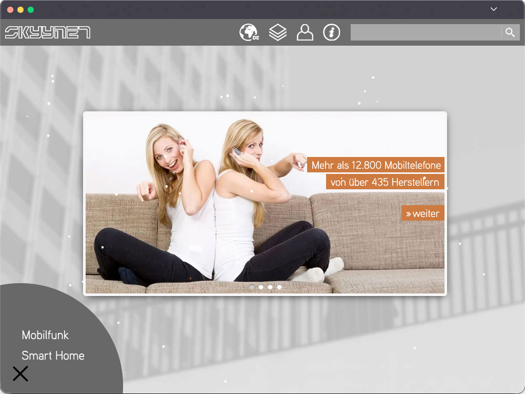 Umstellung der gesamten Homepage. Skyynet benutzt ab sofort keine Frames mehr und wird optimal mit einem CSS2 fähigen Browser, wie Mozilla 1.6, Netscape 7.1, Opera 7.23 oder Safari 1.2 dargestellt. Leider mußte für den Internet Explorer ein Workaround erstellt werden, da dieser mit absoluter Positionierung erhebliche Probleme hat.